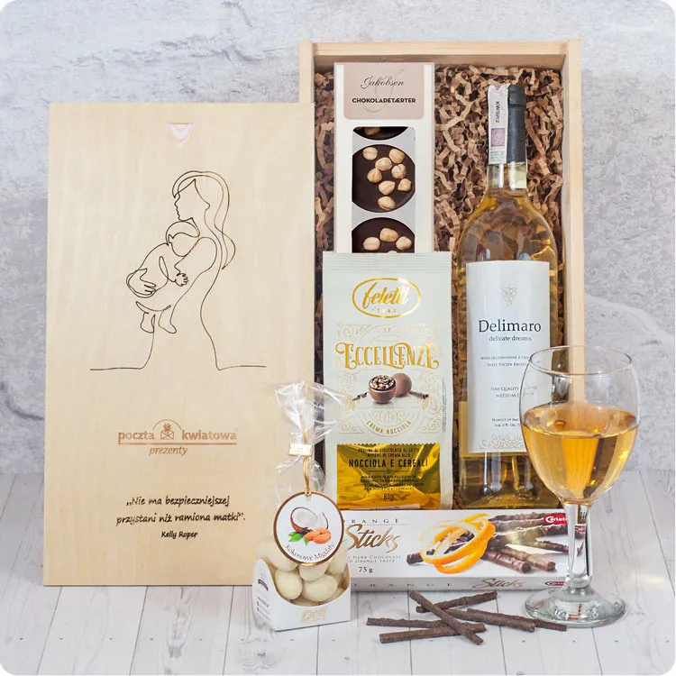 Poczta Kwiatowa® specjalnie z okazji Dnia Matki stworzyła wyjątkowy prezent - Ramiona Matki. Na drewnianej skrzynce widnieje piękny grawerunek przedstawiający matkę z dzieckiem oraz cytat Kelly Roper „Nie ma bezpieczniejszej przystani niż ramiona matki”. W skrzyneczce obdarowana osoba znajdzie migdały w białej czekoladzie, czekoladowe pralinki, białe wino Delimaro, kruchy karmel w czekoladzie oraz czekoladowe paluszki z pomarańczą. Podaruj swojej mamie wyjątkowy prezent i spraw jej wiele radości.