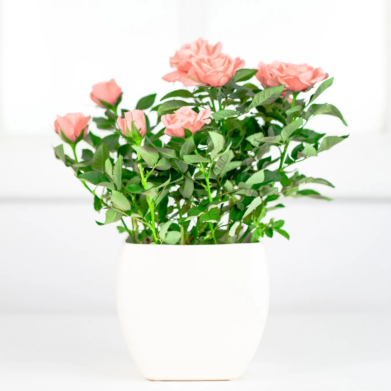 W pełnej okazałośći różowe róże z liścmi w białej doniczce