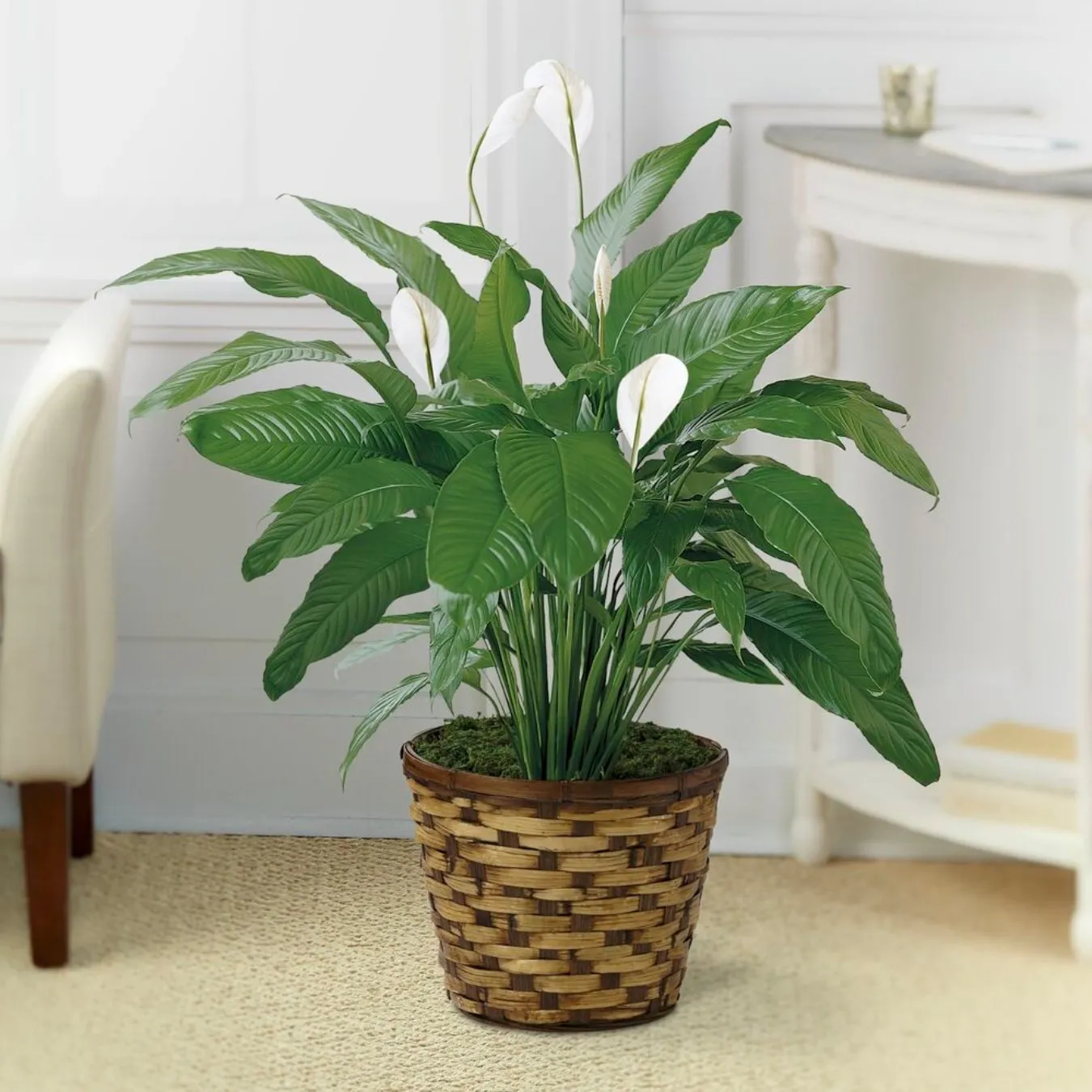 Każdemu przyda się odrobina spokoju w życiu! Znana również jako roślina Spathiphyllum, nasza lilia pokojowa jest ulubieńcem prawie wszystkich i jest idealna na każdą okazję. Ta piękna roślina jest długowieczna i ma niesamowity wpływ na każde pomieszczenie dzięki bujnym liściom i białym kwiatom.