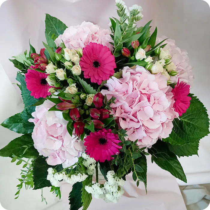 Bukiet z oferty regionalnej - Poczta Kwiatowa® ŁódźRóżowa hortensja to niezwykła kompozycja, w której zderzają się delikatność różowych hortensji, energiczność różowych gerber oraz subtelność alstromerii, tworząc wspaniały i harmonijny obraz.Głównym składnikiem tego bukietu są różowe hortensje, które symbolizują wdzięk, urok oraz wyraziste uczucia. Ich okazałe, kształtne kwiatostany w kolorze delikatnego różu wprawiają w zachwyt i nadają bukietowi charakteru. Różowe gerbery dodają do kompozycji radości i energii, wspaniale łączą się z hortensjami. Ich promienne płatki przyciągają wzrok i tworzą wizualny efekt pełen życia.Bukiet Różowa hortensja to wyrazisty prezent, który sprawdzi się w przeróżnych okolicznościach. Niech to będzie wyraz Twoich uczuć w dniu urodzin, rocznicy czy chwili, w której chcesz podziękować lub wyrazić wsparcie. Jego różnorodność kwiatów i kolorów sprawia, że pasuje do każdej osoby i każdego wydarzenia.