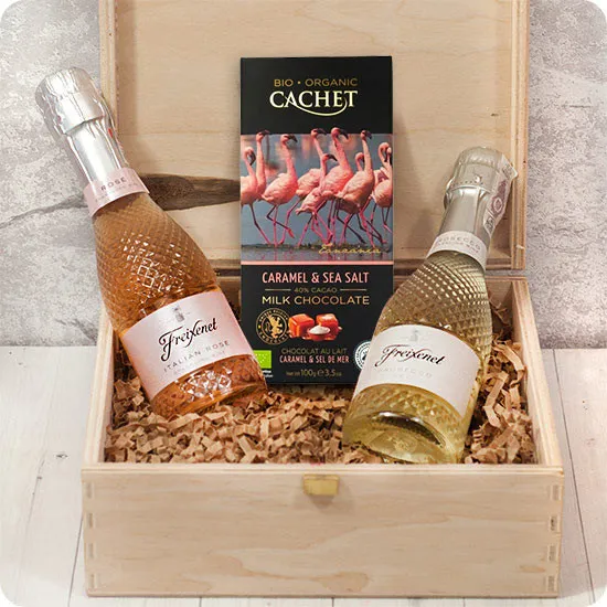 Różowa skrzyneczka to wyjątkowy prezent, który łączy w sobie delikatność smaków i elegancję w jednym. Zawarty w drewnianej, zamykanej skrzyneczce zestaw to prawdziwa uczta dla zmysłów, idealna na różne okazje. W skrzyneczce możemy znaleźć: Prosecco Freixenet i Prosecco Freixenet Italian Rose - dwa eleganckie i delikatne wina musujące, które są uwielbiane przez kobiety. Drewniana skrzyneczka, w której zamknięto ten elegancki zestaw, nadaje prezentowi dodatkowego uroku. Zamykana na klips skrzyneczka może stanowić później praktyczne pudełko na drobiazgi, co sprawia, że prezent nie tylko smakuje wyśmienicie, ale również ma wartość trwałą. Różowa skrzyneczka to nie tylko zestaw pysznych smakołyków, ale także wyraz dbałości o szczegóły i troski o bliskie osoby. Doskonale sprawdzi się jako prezent na wiele okazji, od urodzin po romantyczne spotkanie czy specjalne jubileusze.