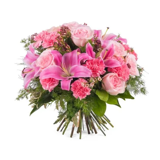Na zdjęciu obok przedstawiamy bukiet w różowych odcieniach. Znaleźć można tutaj między innymi malinowe goździki, rozłożyste lilie, a także klasyczne róże. Całości dopełniają jasnozielone liście.