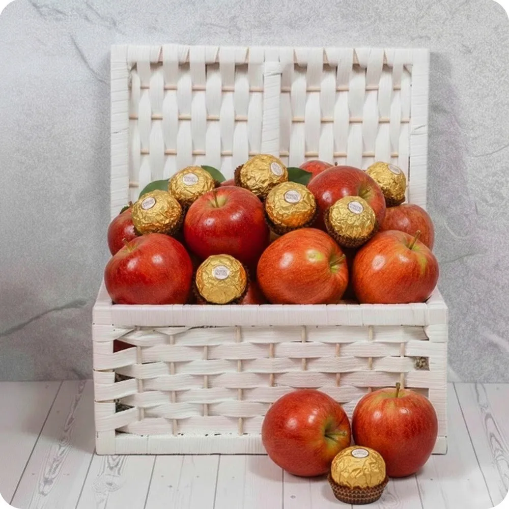 Skrzynka z jabłkami i Ferrero Rocher to elegancki prezent łączący naturalną świeżość owoców z wykwintnym smakiem czekoladek. Starannie dobrane jabłka oraz praliny w złotych opakowaniach tworzą wyjątkową kompozycję, idealną na prezent świąteczny, urodzinowy lub firmowy. Drewniana skrzynka nadaje całości rustykalnego uroku, a jej zawartość zachwyci zarówno miłośników słodyczy, jak i zwolenników zdrowych upominków.