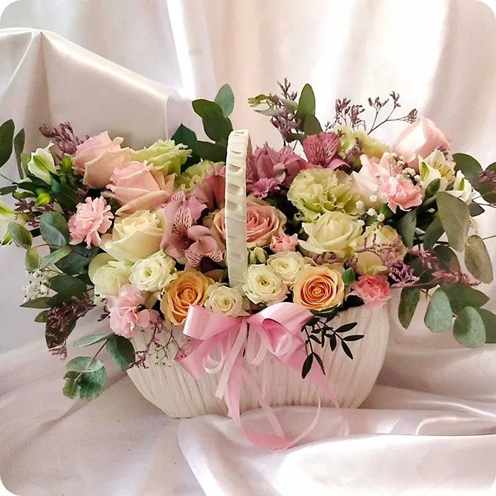 kosz, róże gałązkowe, alstromerie, róże, eustomy, gipsówka, goździki, wstążka
