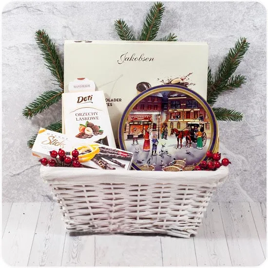 W wiklinowym koszu, obdarowana osoba znajdzie przepyszne łakocie - idealne do rozgrzewającej herbaty. Oprócz eleganckiej bombonierki z czekoladkami i orzechów w czekoladzie, w koszu znajdują się kruche ciastka w puszce z zimowym motywem. Całość dopełniają paluszki o pomarańczowym smaku i czekoladowe figurki w kształcie bałwanków. To wszystko sprawia, że kosz ten jest idealnym prezentem zarówno dla osoby starszej ale również dla dzieci.