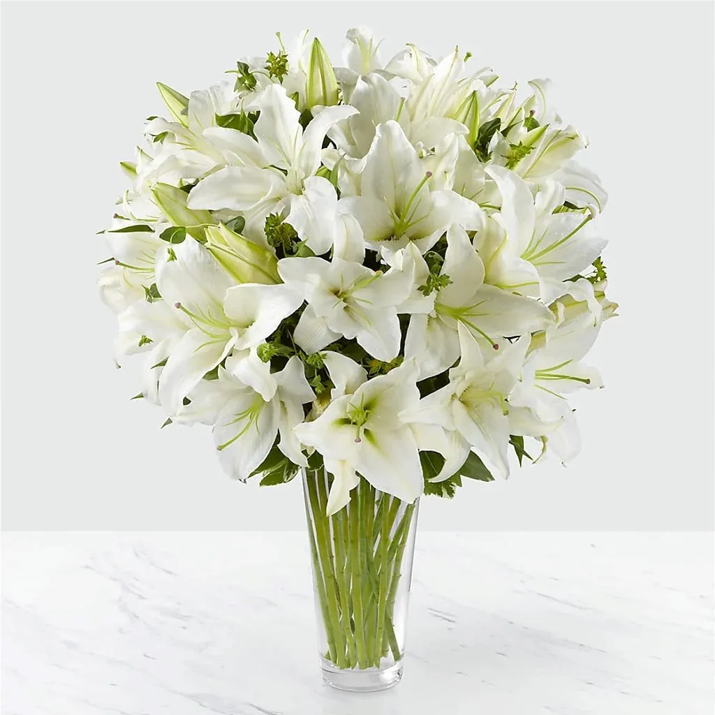 Jasne, białe lilie orientalne tworzą prostą, ale wyrafinowaną aranżację, umieszczoną w eleganckim wazonie z przezroczystego szkła, wysyłając życzenia szczęścia i ...Dostępność: 01.01 - 14.10