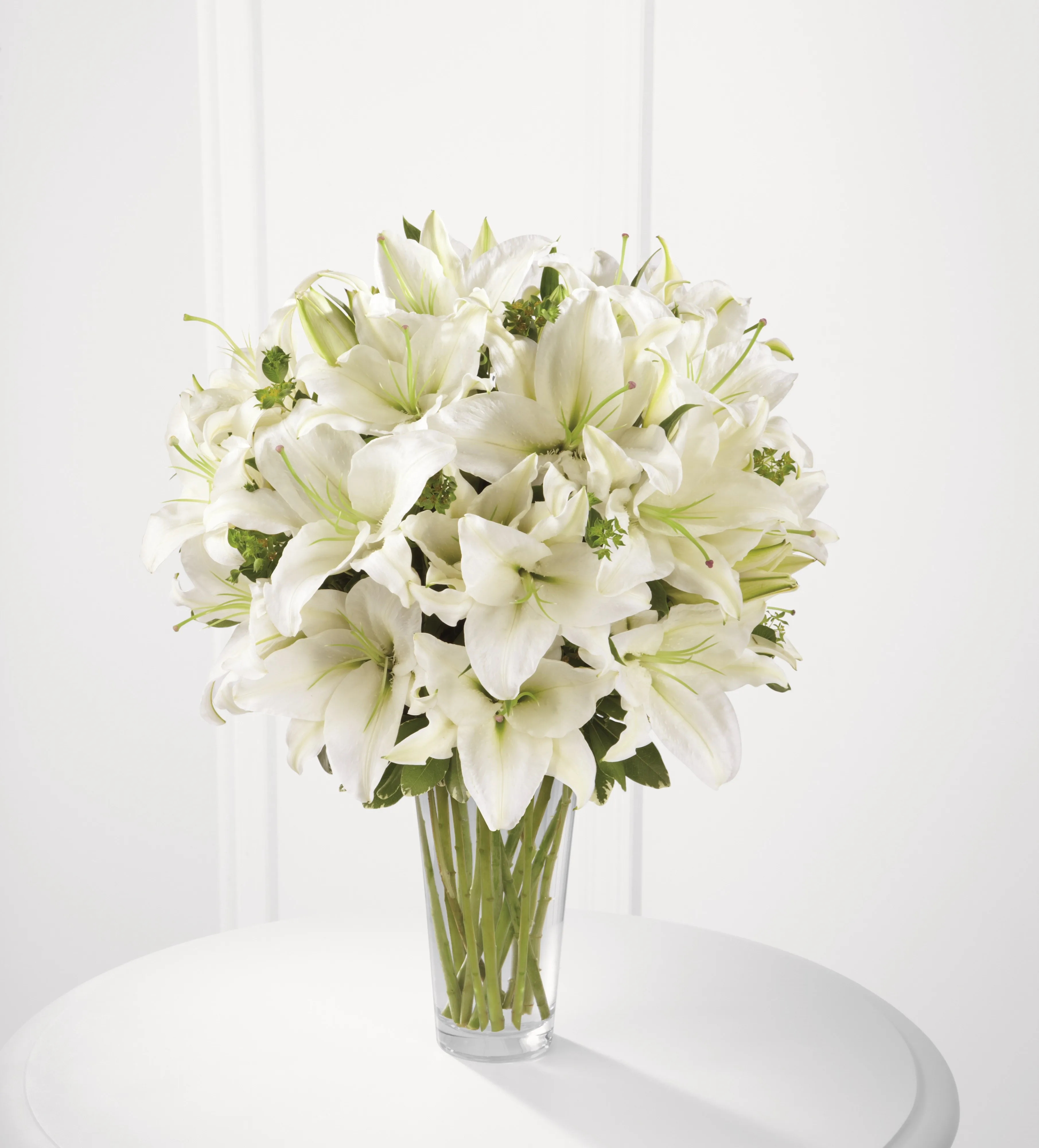 Jasne, białe lilie orientalne tworzą prosty, ale wyrafinowany bukiet, ułożony w eleganckim wazonie z przezroczystego szkła, wysyłając życzenia szczęścia i spokoju w Urugwaju.