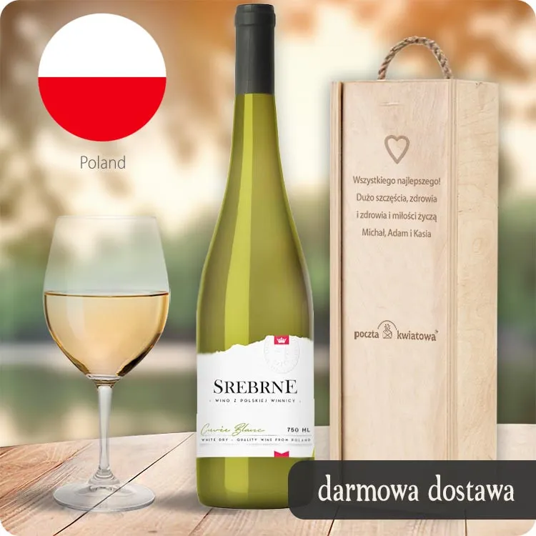 Srebrne to dumny przedstawiciel polskiego winiarstwa, doskonale oddający charakter i unikalność rodzimej ziemi. To wytrawne wino, które nie tylko zachwyca aromatem i smakiem, ale także przynosi na stół nutę elegancji i lokalnego rękodzieła. Wino znajduje się w drewnianej skrzynce, na której można umieścić tekst grawerem.