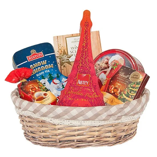 Świąteczny wieczór - ten zestaw wyrazi najcieplejsze myśli lepiej niż jakiekolwiek słowa. W naszym uroczym koszyczku wybór najlepszych słodkości! Między innymi: migdały w czekoladzie, mleczna czekolada Wieża Eiffla, doskonałe praliny Lindt i rozgrzewająca herbata Riston w kwiecistej puszce - ten prezent na pewno rozgrzeje serce obdarowanej osoby.