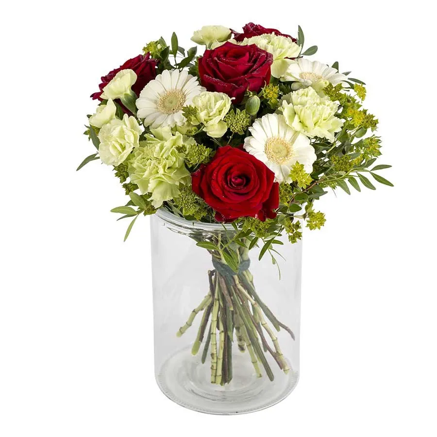 Wspaniały bukiet, który życzy szczęścia i radości odbiorcy. Niski bukiet w czerwono-biało-zielonych kolorach. Klasyka kwiatów, czerwone róże, uzupełniają delikatną i świeżą kolorystykę. Wazon nie wchodzi w skład zestawu.