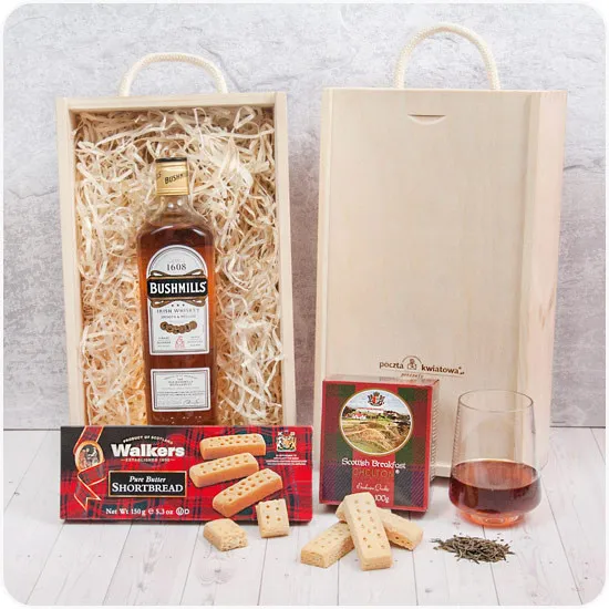 Szkockie marzenie to nowa propozycja Poczty Kwiatowej®. Jest połączeniem różnorodnej gamy smakowej. Reprezentowana przez czarną, sypaną herbatę Chelton oraz oryginalną whiskey Bushmills będzie wspaniałą propozycją dla nie jednego konesera słodyczy. Stworzona w eleganckiej, drewnianej skrzynce prezentowej przypadnie również do gustu każdemu, kto ceni sobie szyk i elegancje. Zamówienia opłacone do godziny 17:00 doręczymy następnego dnia roboczego. Zamówienia na terenie Warszawy doręczamy tego samego dnia po potwierdzeniu telefonicznym. Do wybranych miejscowości doręczamy prezenty także w sobotę. Zestaw nie zawiera szklankiDostępność: Cały rok