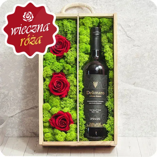 Poczta Kwiatowa® zainspirowana filmem fantasy, nawiązującego do wielu baśni braci Grimm stworzyła podarunek równie fantastyczny co film o tej samej nazwie - Tajemnice lasu. W drewnianej skrzyneczce znajduje się doskonałe hiszpańskie czerwone wino oraz przepiękne czerwone wieczne róże otulone zielonym mchem. Wieczna róża to nic innego jak żywy (ucięty) kwiat, który został poddany specjalnemu procesowi utrwalającemu, dzięki któremu róża zachowuje swój kształt i kolor przez 2 lata. Róża nie wymaga pielęgnacji. Daj się zaczarować lub oczaruj innych tym niezwykłym prezentem. Zamówienia opłacone do godziny 17:00 doręczymy następnego dnia roboczego. Zamówienia na terenie Warszawy doręczamy tego samego dnia po potwierdzeniu telefonicznym. Do wybranych miejscowości doręczamy prezenty także w sobotę.