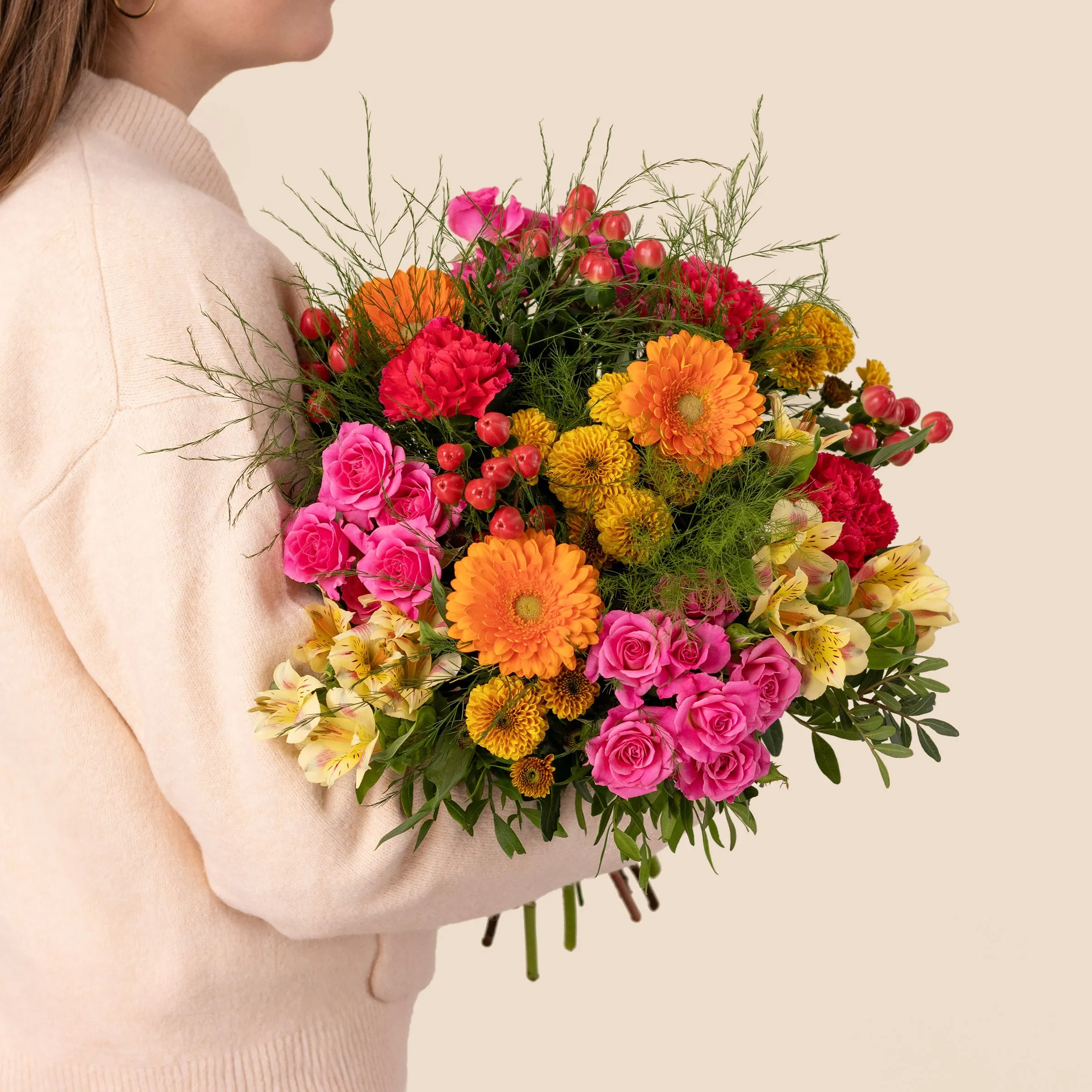 Przekaż najpiękniejsze wyrazy miłości za pomocą okrągłego bukietu Tutti frutti, kwiatowej kompozycji złożonej z róż, goździków, germinis, hypericum i innych różnorodnych kwiatów w kolorach czerwonym, żółtym, różowym i pomarańczowym. Elegancki bukiet, który jest znakiem dobrego smaku na każdą okazję, w pracy lub w domu.