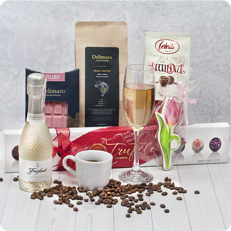 Prezent dla mamy, przyjaciółki, babci? Tylko Ty to zestaw prezentowy z oferty Poczty Kwiatowej®, który świetnie sprawdzi się jako upominek dla bliskiej osoby!Najwyższej jakości produkty z pewnością zaskoczą i zachwycą. Odbiorczyni będzie mogła spróbować doskonałych tureckich trufli, słodkiego pierniczka, różowej czekolady Ruby, wyśmienitej ziarnistej kawy, czekoladowych pralinek oraz wina musującego. Zestaw nie zawiera kosza prezentowego. Produkty zapakowane są wyłącznie w eleganckie podłużne pudełko.