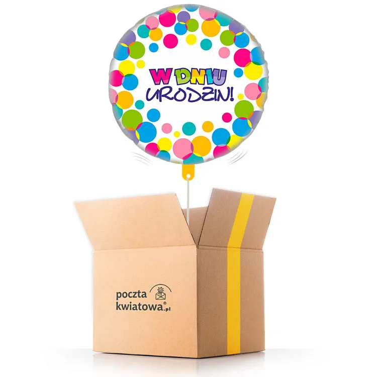 • Balon foliowy z napisem „W dniu urodzin” i kolorowym wzorem kół