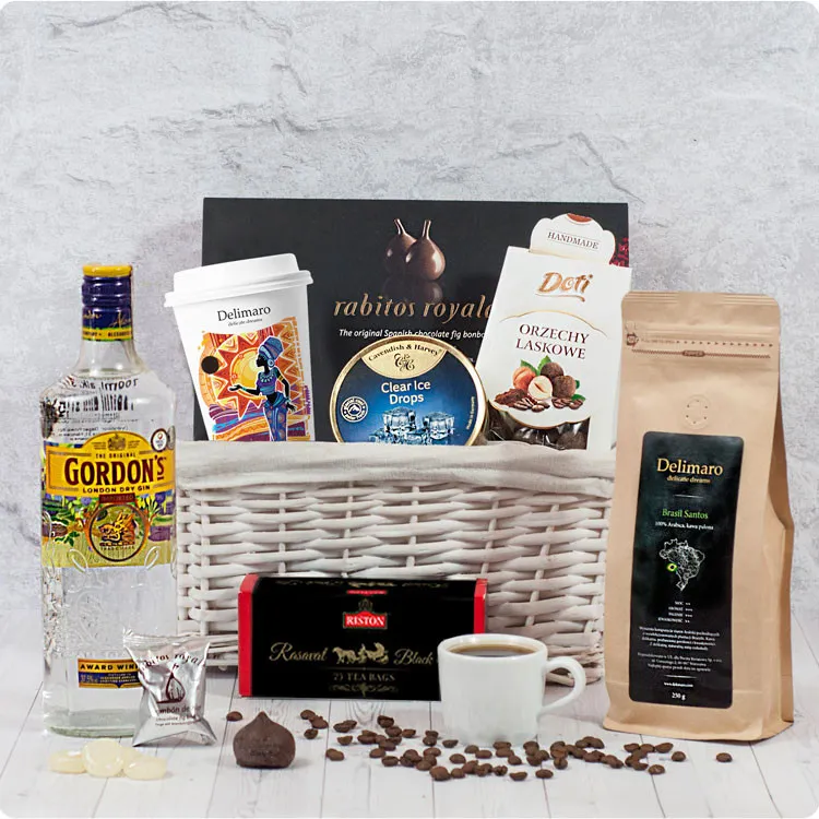 Wyjątkowy prezent dla znajomych, rodziny, przyjaciół? Poczta Kwiatowa® stworzyła kosz prezentowy, w którym każdy znajdzie coś dla siebie - W dobrym guście. W tym oryginalnym i ekskluzywnym zestawie odbiorcy znajdą lodowe dropsy, orzechy laskowe w czekoladzie, aromatyczną herbatę, cacao DecoMoreno, wykwintne figi w całości oblane czekoladą, kawę ziarnistą Delimaro oraz gin Gordon's. Kawa Dalimaro™ Brasil Santos to wysokogatunkowa kawa pochodząca z plantacji regionu Santos w Sao Paulo. Kawa z niską kwaskowością, łagodnym smakiem, aromatem lekkiej drewnianej nuty. 100% Arabica. Opakowanie z wentylem gwarantujące utrzymanie aromatu. Gin Gordon’s to jedne z najpopularniejszych londyńskich dżinów. Jego charakterystyczny, intensywny zapach zawdzięcza owocom jałowca. Wyczuć można również lukrecję, owoce cytrusowe, kolendrę i kminek. Gin Gordon's idealnie komponuje się z tonikiem i kostkami lodu, a także z sokiem pomarańczowym lub grejfrutowym. Zrób niespodziankę i spraw radość swoim najbliższym i podaruj im prezent z klasą i w dobrym guście.