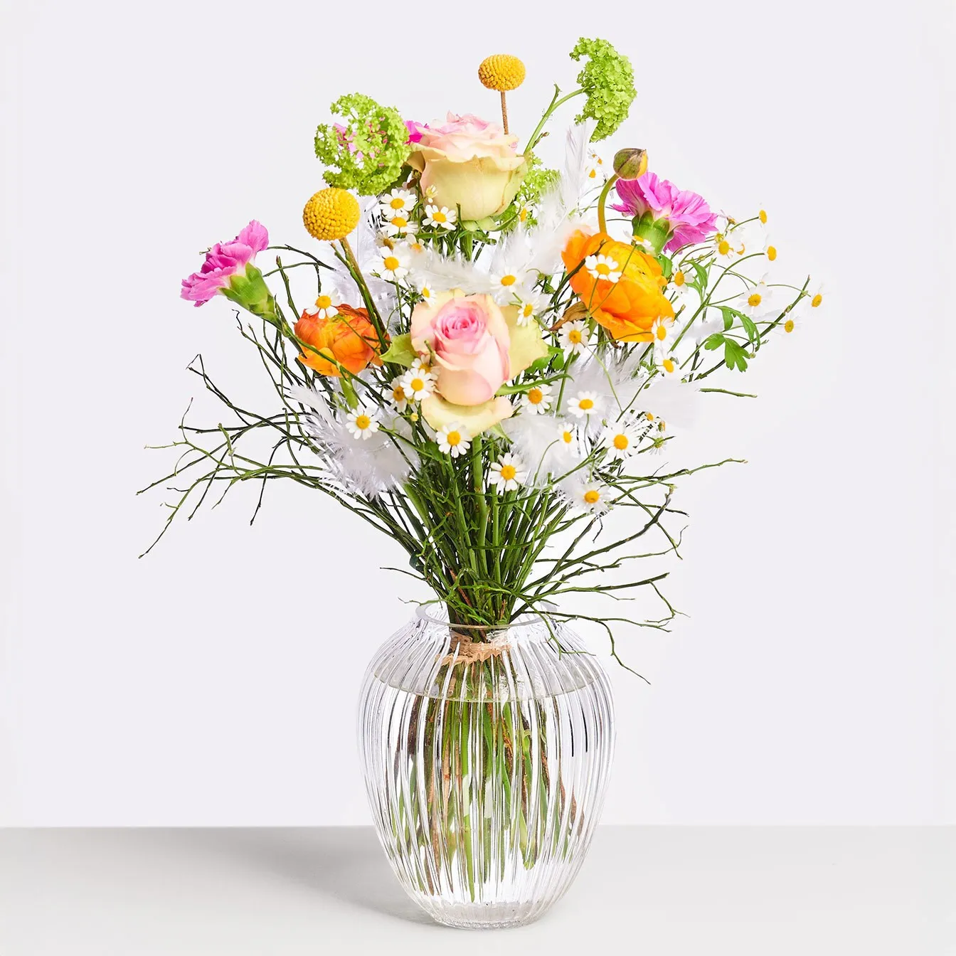 Pięknie zawiązany bukiet w delikatnych odcieniach różu, fioletu, żółci, zieleni i bieli z różami, goździkami, śnieżką, rumiankiem i craspedią. Jako dodatek wykorzystano borówkę amerykańską. Aranżację dopełniają pióra.
