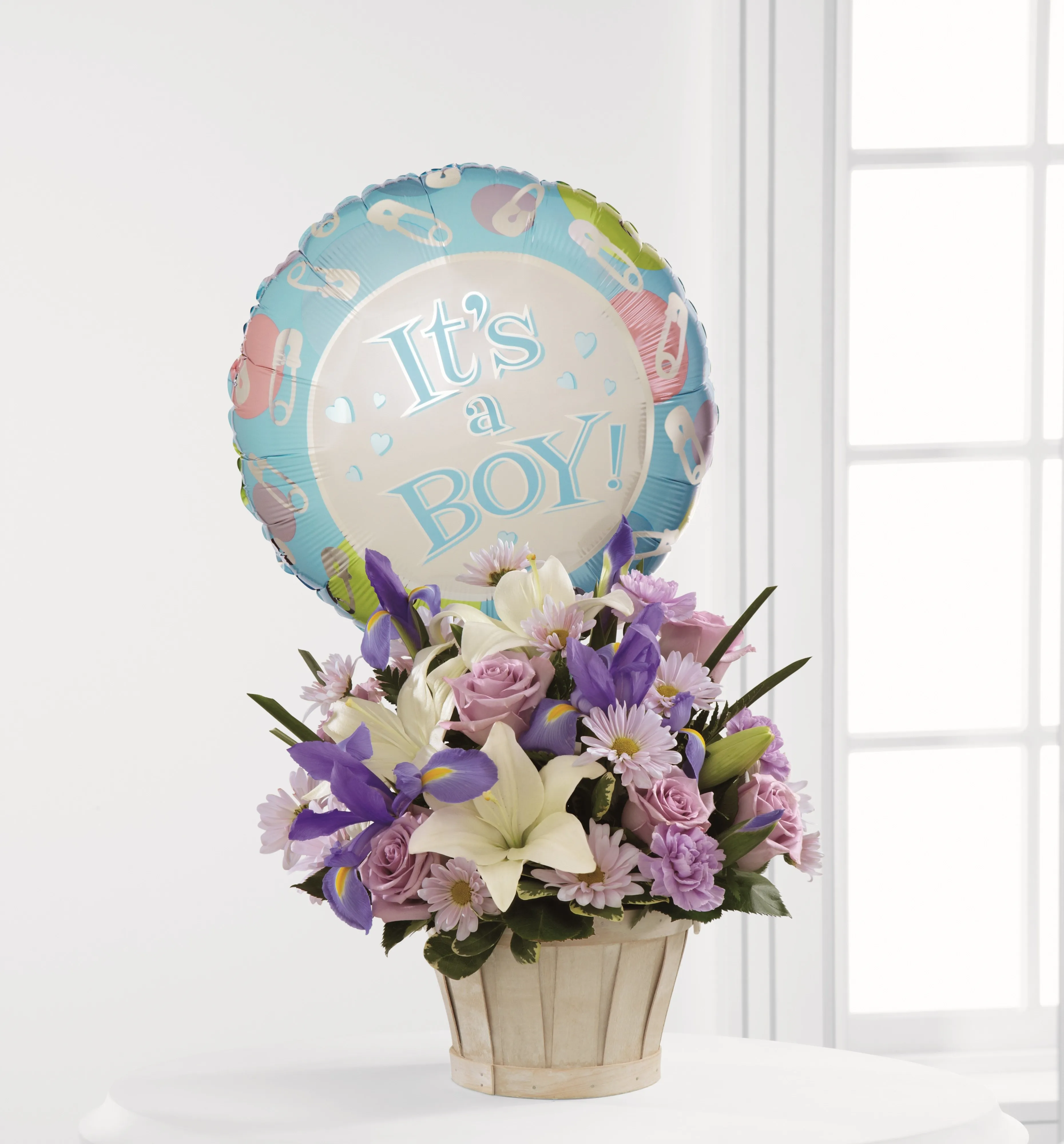Rozkwitający słodką miłością, aby pogratulować nowej rodzinie ich ukochanego chłopca! Lawendowe róże, niebieskie irysy, lawendowe goździki, lawendowe stokrotki, białe lilie azjatyckie i bujna zieleń są pięknie ułożone w okrągłym, bielonym koszu. Ta niesamowita kompozycja kwiatowa z balonem Mylar z napisem "To chłopiec!" będzie idealnym powitaniem nowego członka rodziny. Piękne kwiaty z dostawą w Urugwaj.