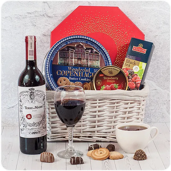Produkt preferowany przez osoby o wygórowanym podniebieniu, idealny prezent na wszelkiego rodzaju rocznice, przyjęcia dla młodszych i starszych osób. Przy wyborze koszyka pełnego niespodzianek każdy znajdzie coś dla siebie, wyszukaną herbatę owocową, czy włoskie wino wytrawne z rejonów Abruzji. Idealne połączenie dające chwilę relaksu przygotowuje nam kompozycja owocowej herbaty wraz z ciasteczkami maślanymi.