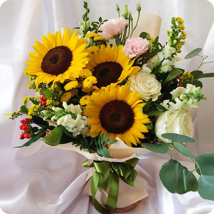 róże, słoneczniki, goździki, hipericum, lwia paszcza, zieleń dekoracyjna, wstążka, papier dekoracyjny