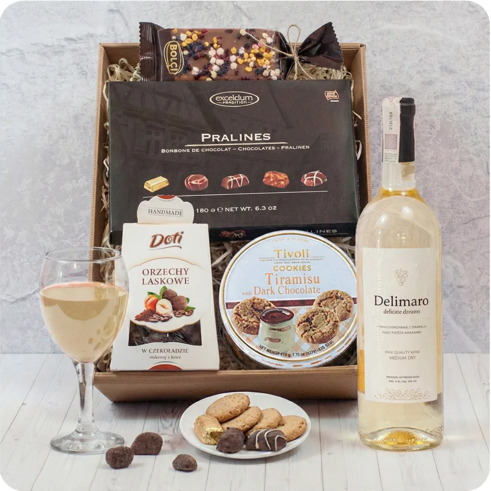Odbiorcy znajdą wewnątrz idealny balans między klasyką a nutą egzotyki. Degustację warto zacząć od orzeźwiającego, białego półwytrawnego wina Delimaro™, dojrzewającego w macedońskim słońcu. Stanowi ono doskonałe tło dla słodkich skarbów ukrytych w pudełku. A jest co odkrywać! Na miłośników owocowych nut czeka wyjątkowa tabliczka mlecznej czekolady Bolci Creation, wzbogacona smakiem pomarańczy, gujawy i jeżyny. Wielbiciele deserowych klasyków zachwycą się chrupiącymi ciastkami Tivoli inspirowanymi włoskim tiramisu oraz eleganckim pudełkiem wykwintnych pralin Excelcium Black. Całość dopełniają aromatyczne, chrupiące orzechy laskowe w czekoladzie z subtelnym dodatkiem kawy od marki Doti.