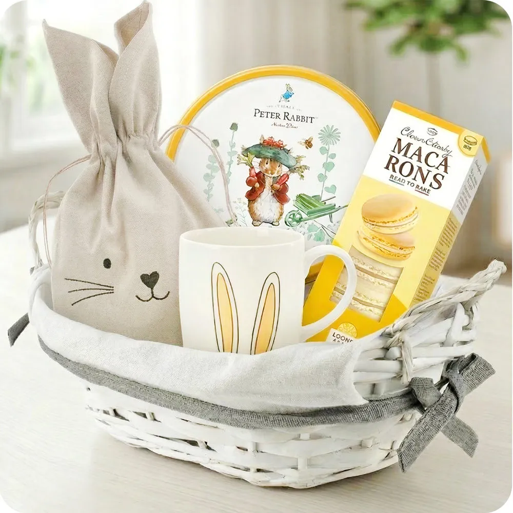 Ten uroczy zestaw prezentowy w wielkanocnym stylu to idealny upominek dla miłośników słodkości i przytulnych chwil. W eleganckim koszyku ozdobionym kokardą znajdują się: