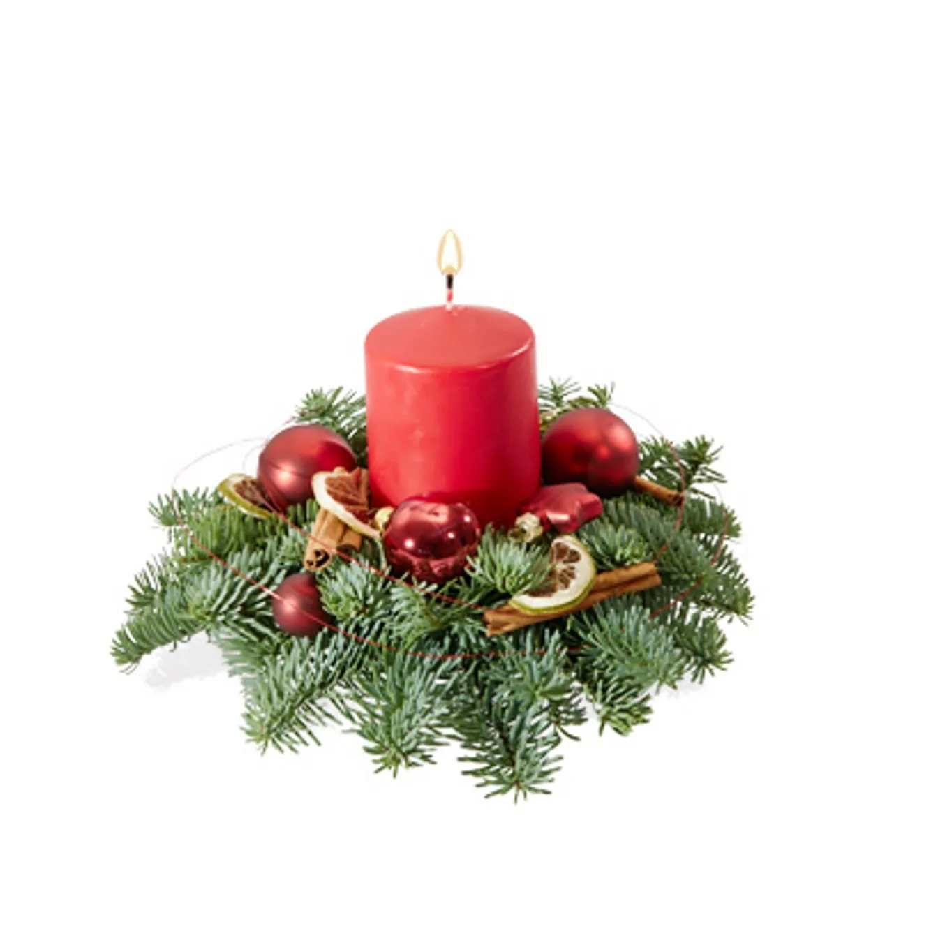 Naszą propozycją na tę okazję jest świąteczna kompozycja, złożona z gałązek drzewa iglastego, a także bombek i innych świątecznych dodatków. Całości dopełnia czerwona świeczka.