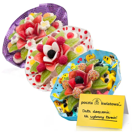 Bukiety żelkowe to nowa odsłona słodkości uwielbianych nie tylko przez dzieci. Żelki ułożone w sprytny sposób - w kształcie bukietu jako słodsza wersja tradycyjnego układania kwiatów. Kolorowa osłonka i barwne żelki o różnym kształcie tworzą niezwykłą harmonię. W zestawie Poczty Kwiatowej® znajdują się trzy wspaniałe bukieciki: Gwiazdka, Bawarka i Kordek. Spraw najbliższym słodką niespodziankę i prześlij im Żelkowe szaleństwo. Do bukietu z żelkami załączymy bilecik, na którym możesz zamieścić własne życzenia. Cena produktu zawiera koszt przesyłki do dowolnego miejsca w Polsce. Zamówienia opłacone do godziny 17:00 doręczymy następnego dnia roboczego. Zamówienia na terenie Warszawy doręczamy tego samego dnia po potwierdzeniu telefonicznym. Do wybranych miejscowości doręczamy prezenty także w sobotę.