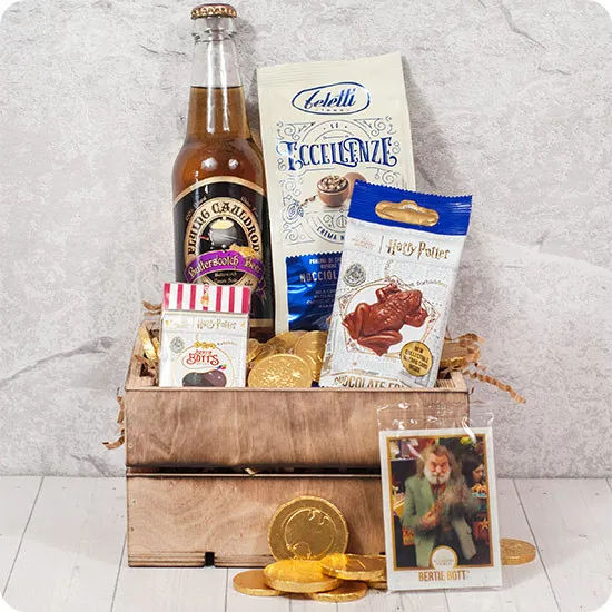 Zestaw Harry Potter to magiczna podróż do świata czarodziejskich smaków i niezwykłych doznań znanego z serii książek i filmów. Umieszczony w drewnianej skrzynce, ten prezent przywołuje na myśl atmosferę Hogwartu i tajemniczego świata, który zachwyca zarówno fanów, jak i tych, którzy są gotowi odkryć magię.Wnętrze drewnianej skrzynki kryje:Złote czekoladowe monety, które przypominają o banku Gringotta i handlu w magicznym świecie. Piwo bezalkoholowe o karmelowym smaku to prawdziwa uczta dla podniebienia, nawiązująca do napojów serwowanych w Trzech Miotłach. Czekoladowa żaba, znana z Hogwartu, to nieodłączny element tego magicznego zestawu, który dodaje nuty słodyczy i nostalgii. Fasolki wszystkich smaków to niezwykła niespodzianka, ponieważ każda z fasolek kryje w sobie inny, czasem zaskakujący smak, co stanowi prawdziwe wyzwanie dla odważnych.Pralinki Fiore, umieszczone w tej magicznej skrzynce, to elegancki dodatek, który harmonizuje z całością, tworząc smakowitą symfonię dla miłośników słodyczy.Zestaw Harry Potter to nie tylko zbiór smakołyków, ale także wyjątkowy sposób na przeniesienie się w świat magii i przygód. Idealny dla fanów serii, jak i dla tych, którzy pragną doświadczyć niezwykłego uroku tego fantastycznego świata. Ciesz się każdym smakiem, otwierając skrzynkę pełną magii Harry'ego Pottera!
