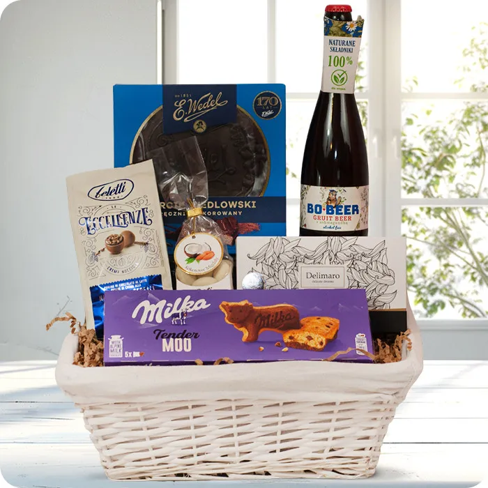 Zestaw miłych niespodzianek to doskonały prezent dla wszystkich miłośników słodkich przyjemności. W eleganckim koszyku kryją się wyśmienite smakołyki, które sprawią radość każdemu smakoszowi.Torcik wedlowski Wedel jest kwintesencją słodyczy i tradycji polskiej czekolady. To pyszna niespodzianka dla podniebienia, idealna na specjalne okazje.Bo Beer Gruit z ashwagandą - bezalkoholowe i niskokaloryczne piwo na bazie ziół, ziaren zbóż, słodu, drożdży, górskiej wody i ashwagandy zmniejszającej stres oraz zmęczenie.Pralinki czekoladowe Feletti - wyjątkowe połączenie gładkiej czekolady i delikatnego nadzienia, które rozpływa się w ustach, pozostawiając smak niebiańskiego luksusu.Ciasteczka Milka Tender Moo to kolejna niespodzianka w tym zestawie - miękkie ciasteczka z mleczną czekoladą, które z pewnością przypasują do każdej herbaty czy kawy.Kawa rozpuszczalna Delimaro, która dodaje energii i przyjemności do każdego poranka czy popołudnia.Migdały w białej czekoladzie z kokosem Doti to idealna przekąska dla miłośników połączenia orzechowego smaku migdałów z delikatną słodyczą białej czekolady i kokosa.Zestaw miłych niespodzianek to nie tylko zestaw smaków - to prawdziwa uczta dla zmysłów, która sprawi radość każdemu, kto ceni sobie słodkie przyjemności i wykwintne smaki. To doskonały prezent na każdą okazję, który zaskoczy i ucieszy każde podniebienie.Dostępność: 01.01 - 31.12