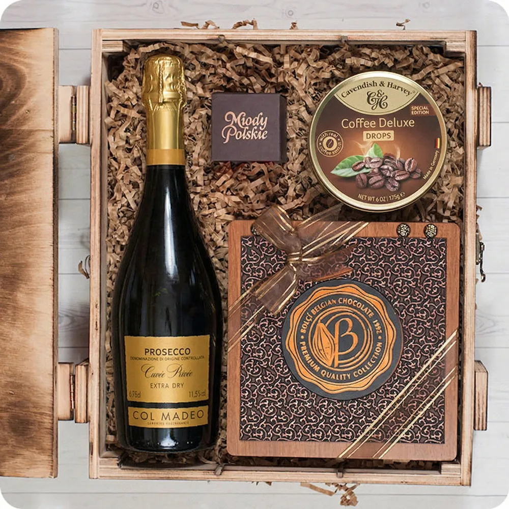 Zestaw szampański to luksusowy prezent, który z pewnością zadowoli nawet najbardziej wymagających smakoszy. Ten elegancki zestaw to kombinacja wyrafinowanego smaku, delikatności i wysokiej jakości składników, zapakowanych w urokliwej drewnianej skrzynce o przydymionym wykończeniu.