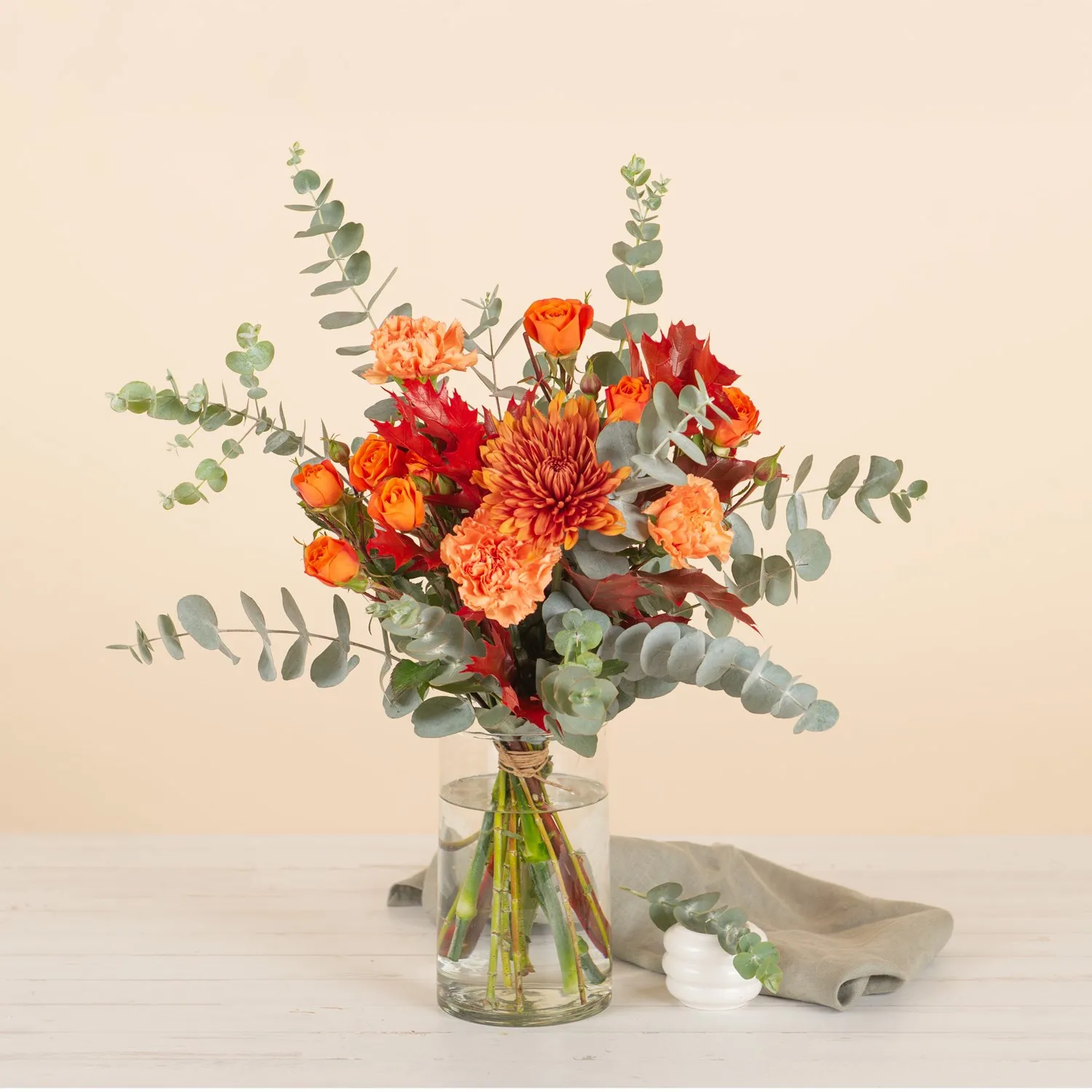 Eksplozja kolorów, która rozjaśni cieplejsze miesiące. Wibrujące pomarańczowe chryzantemy jednokwiatowe, intensywne goździki i energetyczne róże w sprayu są wzmocnione bordowymi liśćmi dębu i świeżością eukaliptusa. Mieszanka, która zaskakuje efektem wizualnym i wyrafinowaną atmosferą. Idealny na prezent urodzinowy, podziękowanie lub po prostu, aby rozjaśnić każdy dzień specjalnym gestem.Dostępność: 17.01 - 28.01, 29.01 - 31.12