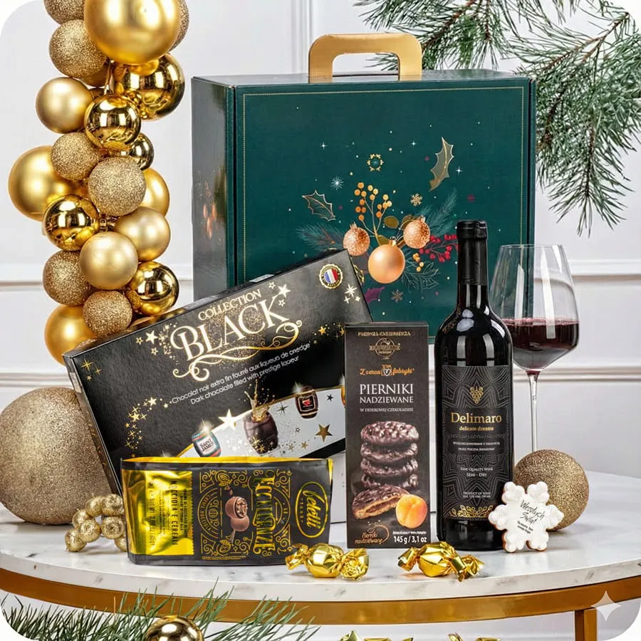 Ten zestaw to klasyczne połączenie elegancji i świątecznych smaków, zapakowany w stylowe pudełko z dekoracją świąteczną i gotowy do wręczenia. Doskonale sprawdzi się jako prezent dla klientów, współpracowników lub bliskich, łącząc prestiż, wyjątkowy smak i świąteczne ciepło.