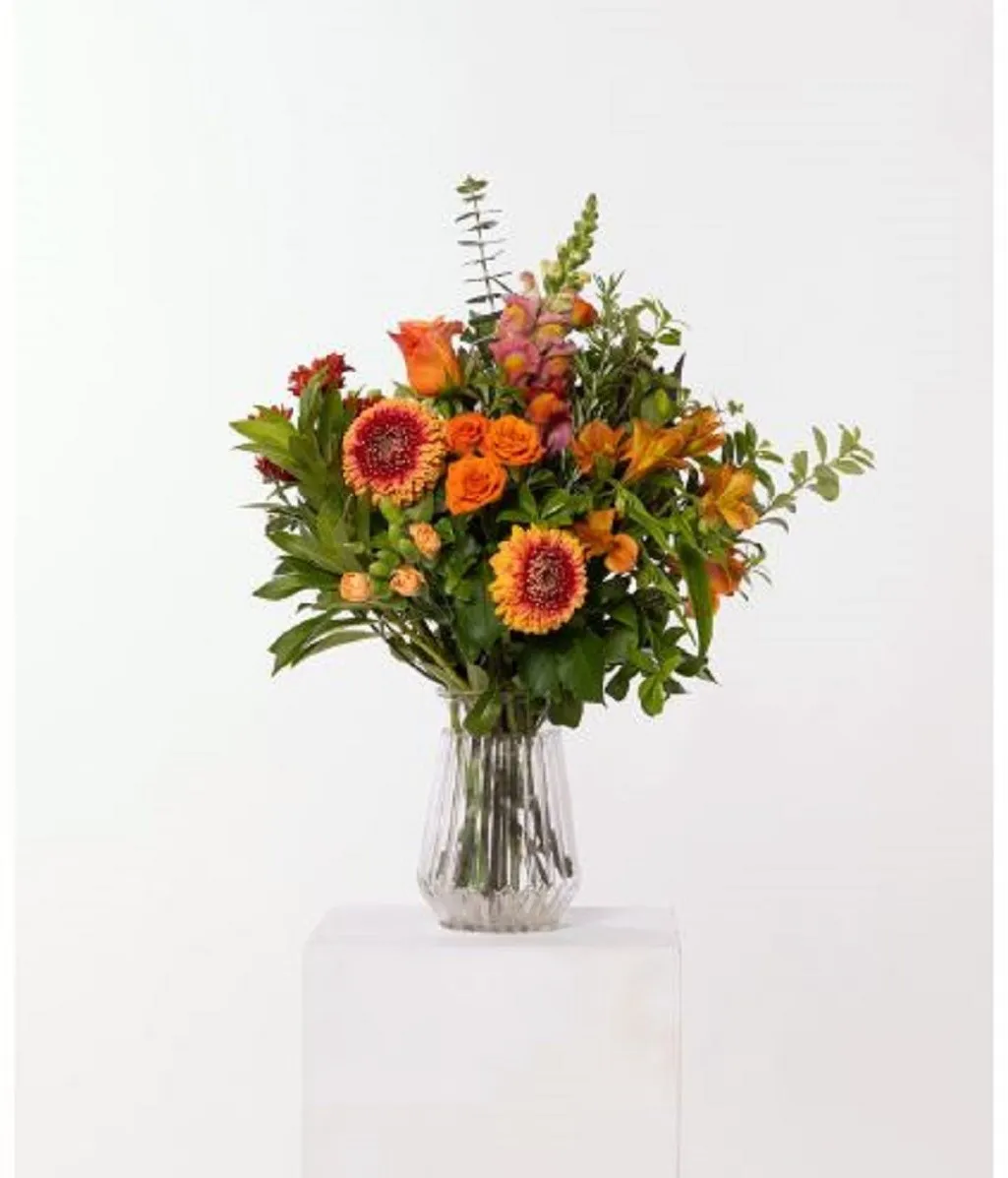 Golden Hour in Vase to łatwa do podarowania jesienna aranżacja, zaprojektowana w wazonie, dzięki czemu jest gotowa do użycia. Charakteryzuje się ciepłymi pomarańczami i czerwieniami, zrównoważonymi świeżymi odcieniami zieleni i delikatnymi akcentami brzoskwini i kremu, wykończonymi lekką, delikatną zielenią dla naturalnego, przewiewnego wyglądu. Ręcznie wykonane przez doświadczoną kwiaciarnię Interflora przy użyciu najświeższych kwiatów dostępnych w danym dniu, dzięki czemu każda aranżacja jest wyjątkowa, zachowując tę samą kolorystykę i styl.