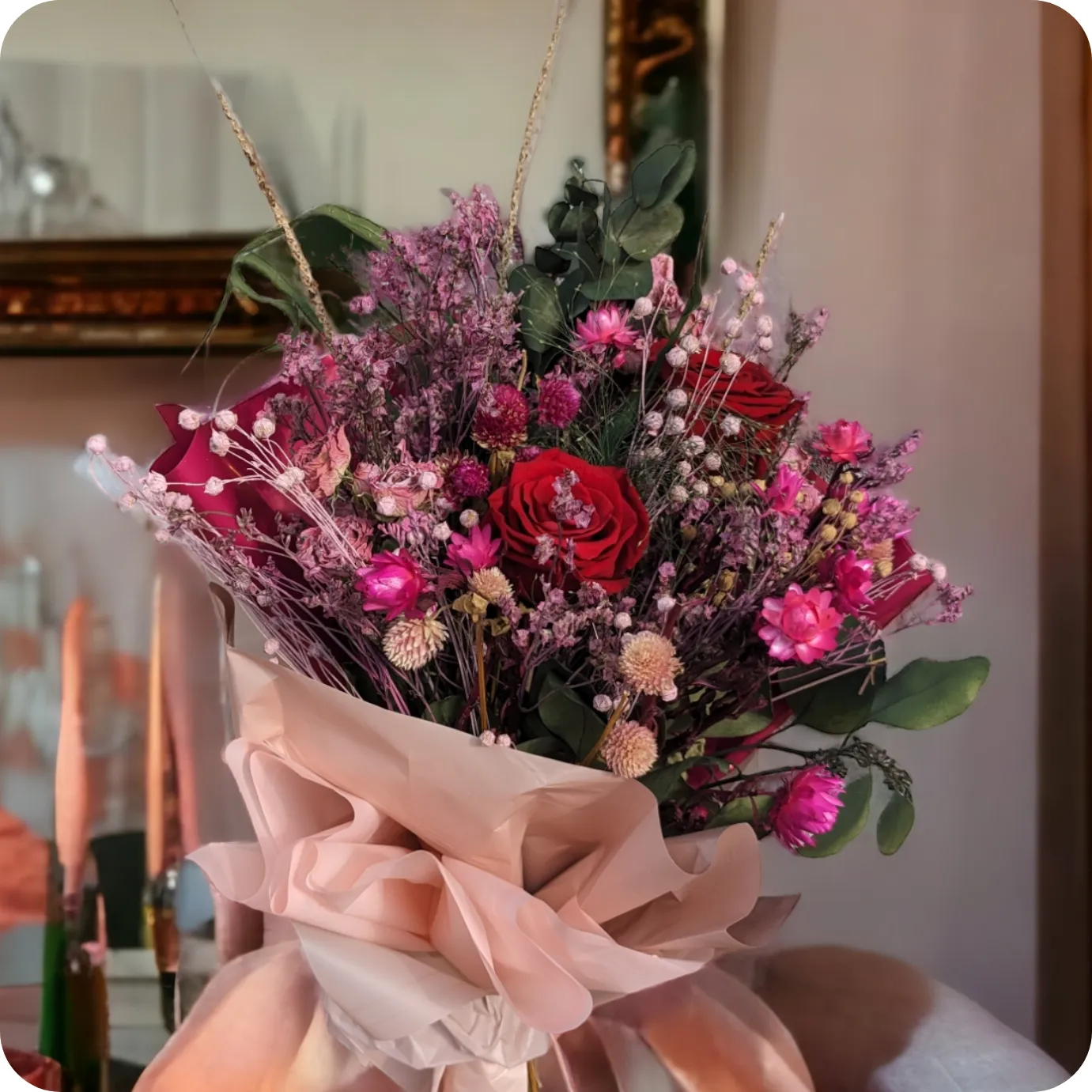 Bukiet z oferty regionalnej - Poczta Kwiatowa® WarszawaZmysłowy Rozkwit to bukiet, który emanuje elegancją, romantyzmem i trwałym pięknem. Składający się z suszonych kwiatów i roślin, a także zawierający wieczne czerwone róże, ten bukiet jest wyrazem wyjątkowego wdzięku i miłości.Wieczne róże to nic innego jak żywe (ucięte) kwiaty, które zostały poddane specjalnemu procesowi utrwalającemu, dzięki któremu róże zachowują swój kształt i kolor przez 2 lata. Róże nie wymagają pielęgnacji.Zmysłowy Rozkwit to doskonały prezent na wiele okazji, od rocznic i urodzin po Dzień Zakochanych czy zaręczyny. Jest to bukiet, który przynosi ze sobą nie tylko piękno kwiatów, ale także długotrwałą miłość i namiętność. Ten bukiet przypomina nam o sile uczuć i trwałym pięknie miłości, które rozwija się i kwitnie jak wieczne róże.